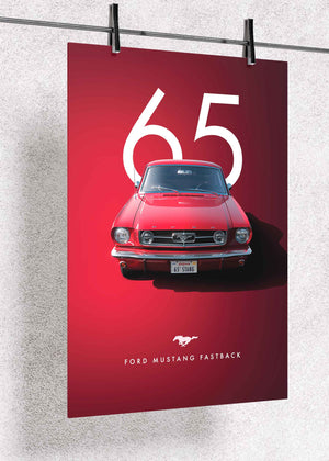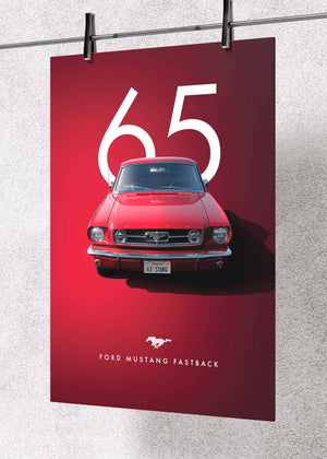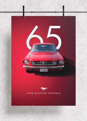 This premium metal poster pays tribute to the legendary 1965 Ford Mustang Fastback — the model that defined the American muscle-car era. Featuring a vivid red color palette with a clean “65” backdrop, the artwork highlights the car’s unmistakable front fascia, iconic grille emblem, and vintage California plate, all rendered with crisp, high-definition accuracy.