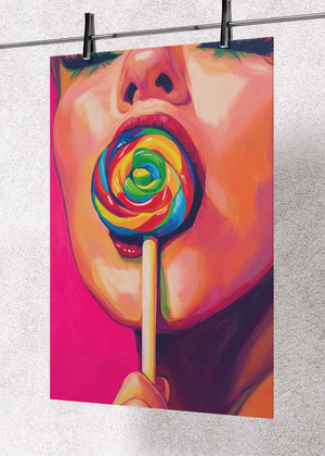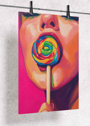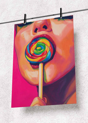 This premium metal poster features a striking close-up portrait of a woman with glossy lips holding a bright, rainbow-colored lollipop. Painted in bold, expressive strokes and electrifying neon tones, the artwork bursts with personality and color — creating a high-impact visual statement that instantly energizes any space.