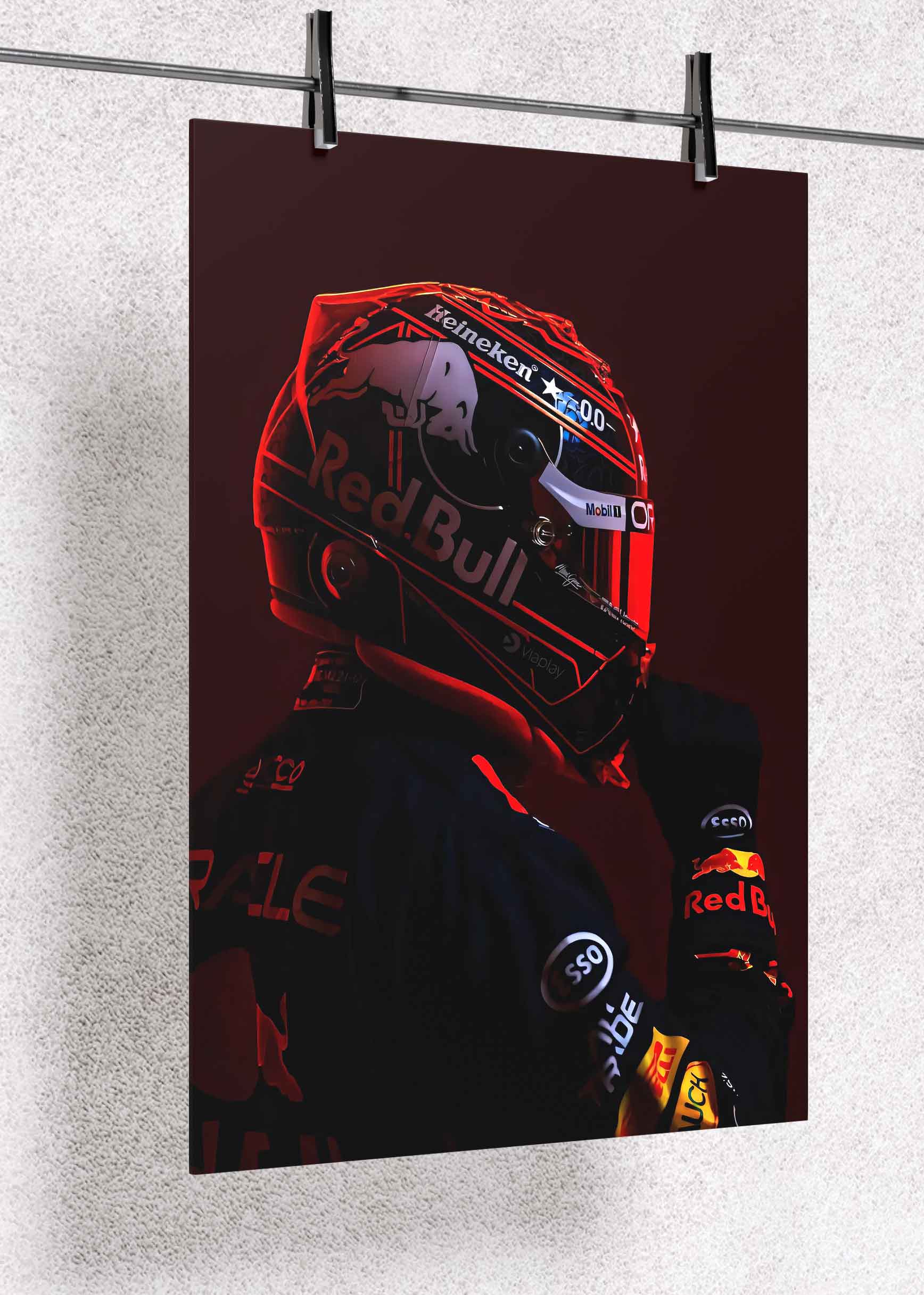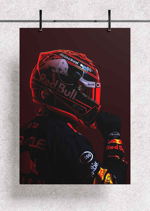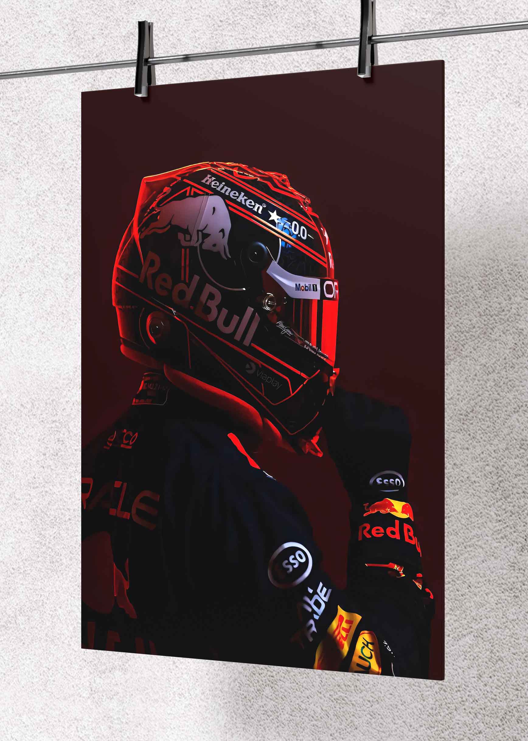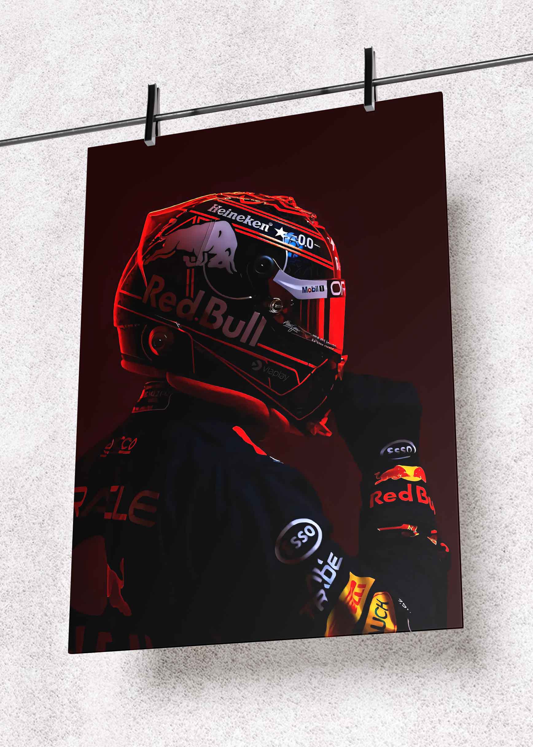 This premium metal poster features a dramatic side-profile portrait of a Red Bull Racing driver, captured in deep shadows and glowing red highlights. The detailed helmet design, sponsor graphics, and powerful lighting create an intense, high-energy atmosphere that instantly elevates any space.