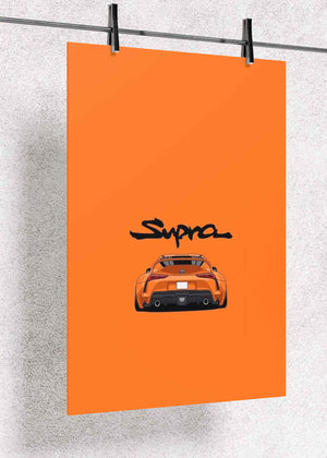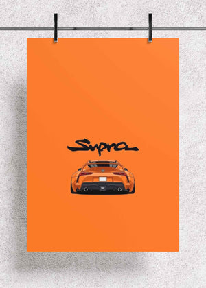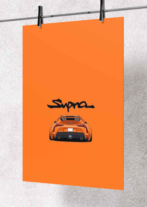 This premium metal poster features a bold, clean illustration of an orange Toyota Supra from the rear, centered on a vibrant orange background with a stylish handwritten “Supra” script above it. The simplicity of the design combined with the aggressive stance of the car creates a modern, eye-catching artwork that stands out in any space.