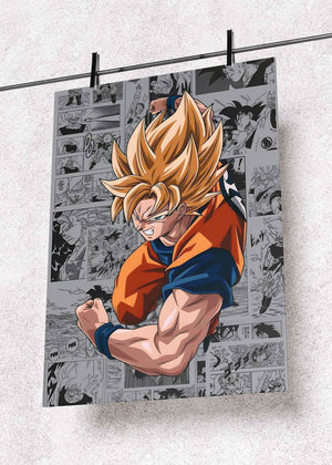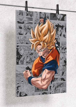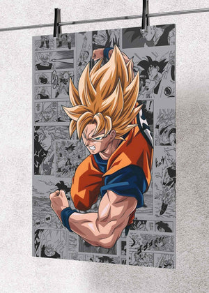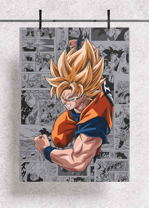 This premium metal poster features a dynamic illustration of Goku in his iconic Super Saiyan form, exploding with power against a backdrop of classic Dragon Ball manga panels. The contrast between the grayscale comic collage and the vivid, full-color Goku gives the artwork a striking, high-impact look that commands attention in any space.